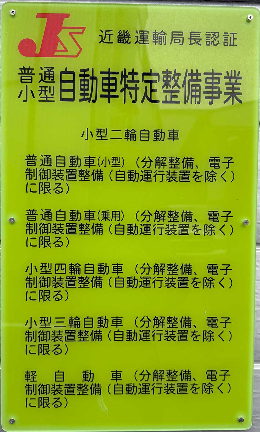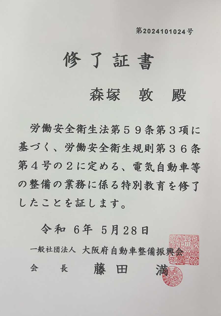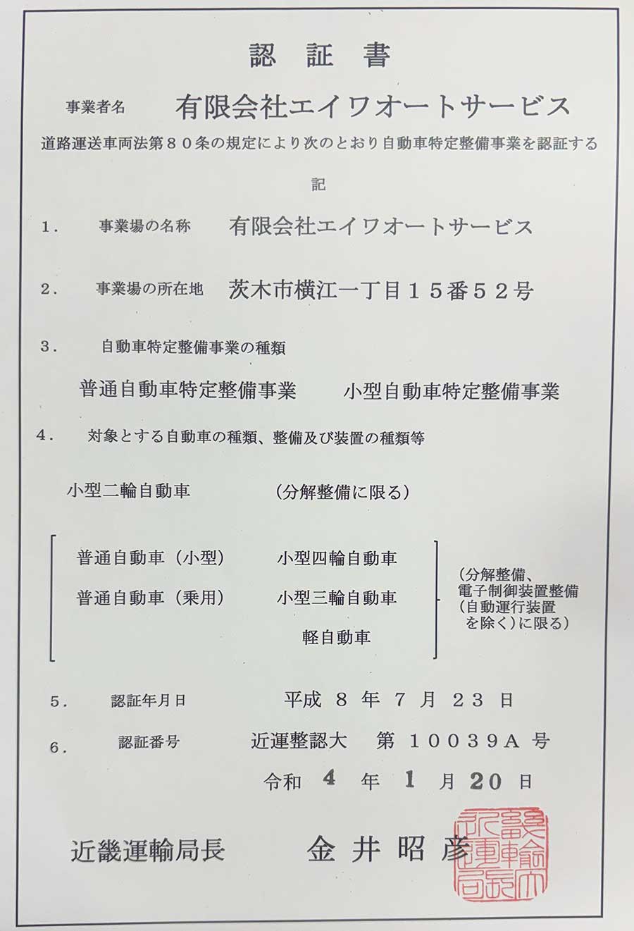 - 近畿運輸局長認証 自動車特定整備事業工場(認証番号:近畿整認第ハ 10039A )